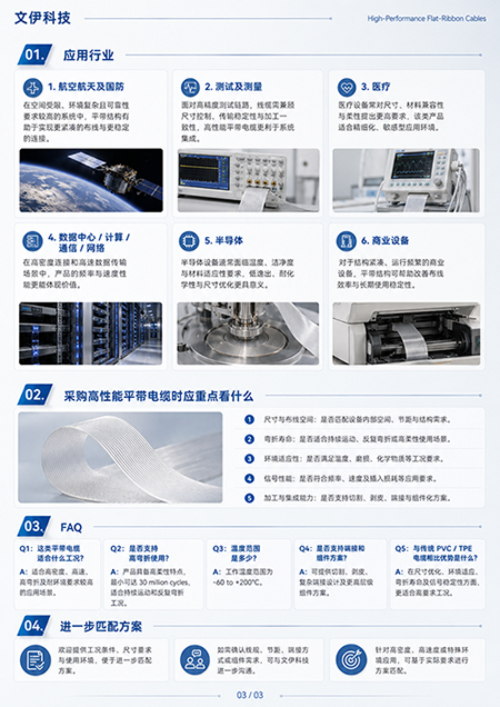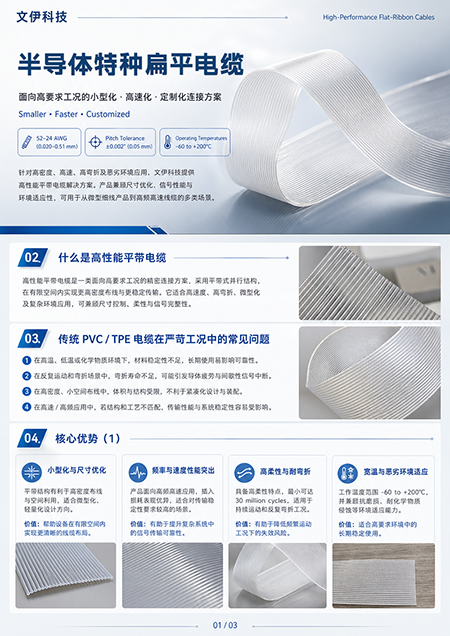 文伊科技关注洁净室与高端自动化设备中的线缆应用问题,围绕无尘扁平排线、高性能平带电缆、高柔性特种线缆等方向,为客户提供更适合狭小空间、高频运动和洁净环境的线缆解决方案。